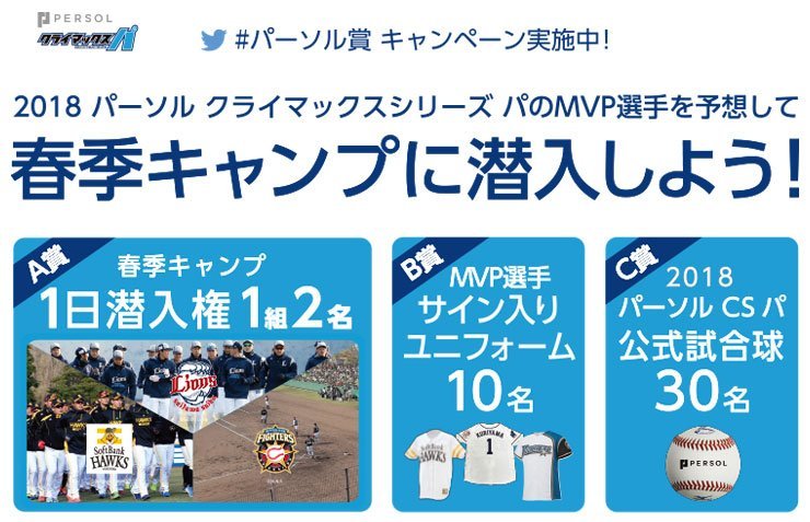 2018年度パシフィック・リーグオフィシャルスポンサーの総合人材サービスのパーソルホールディングス株式会社では、『パーソル クライマックス パ』のMVP選手に贈呈する「パーソル賞」受賞選手を予想して当てると、抽選で優勝チームの春季キャンプに潜入できるTwitterキャンペーンを開始いたします。