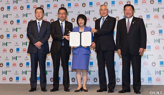 北海道、北広島市、北海道日本ハムファイターズ、北海道ボールパーク(HBP)は11月5日(月)、北広島市に建設される新球場による地域活性化効果の全道への波及、北海道のスポーツ振興に向けて相互に連携、協力しながら協働事業に取り組むことにし、協定を締結いたしました。