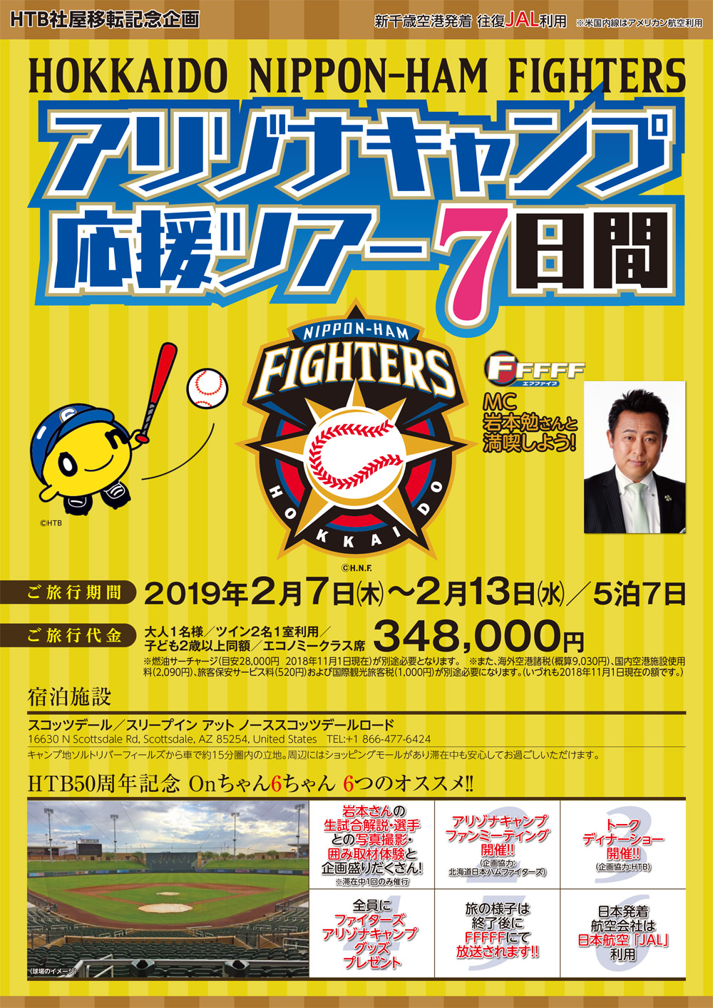 北海道日本ハムファイターズは日本一奪回を目指して、2019年の春季キャンプ前半をアリゾナで実施いたします。つきましては、今回もアリゾナキャンプツアーを実施することが決定いたしましたのでご案内いたします。2019年2月5日(火)出発のANAプレゼンツ「HBCラジオ斉藤こずゑさんと行く!アリゾナキャンプ応援ツアー」と、2月7日(木)出発のJTB北海道「北海道日本ハムファイターズ アリゾナキャンプ応援ツアー7日間 FFFFF MC岩本勉さんと満喫しよう!」の2つのツアーを実施いたします。両ツアーとも特典としてアリゾナファンミーティングにご参加いただけます。