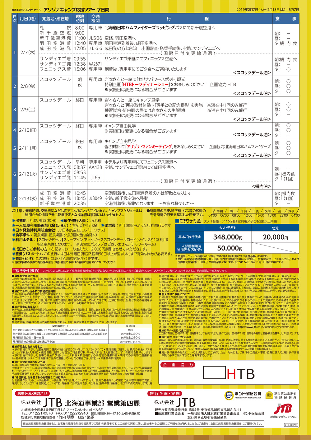 | <2月7日(木)> 札幌==新千歳空港発(午前)→羽田空港着(午後)==成田空港発(夕刻)→フェニックス着(午後)=ホテル【スコッツデール泊】 <2月8日(金)> ホテル=【岩本さんと一緒にセドナパワースポット観光・HTBトークディナーショー】=ホテル【同上】 <2月9日(土)> ホテル=【岩本さんと一緒にキャンプ見学】=ホテル【同上】 <2月10日(日)> ホテル=【キャンプ自由見学】=ホテル【同上】 <2月11日(月・祝)> ホテル=【キャンプ自由見学】=【アリゾナファンミーティング】=ホテル【同上】 <2月12日(火)> ホテル==フェニックス発(午前)→成田空港へ【機中泊】 <2月13日(水)> 成田空港着(夕刻)→新千歳空港着(夜)