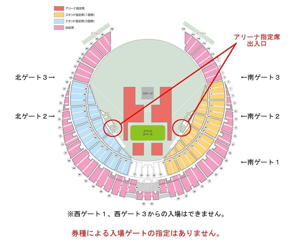 チケット券種により入場ゲートの指定はございません。北ゲート2・3、南ゲート1~3よりご入場ください(北ゲート1、西ゲート1、西ゲート3および東ゲートからの入場はできません)。アリーナ指定席をご利用のお客様は、各ゲートよりご入場いただき、フィールドシート付近に設置している階段(1・3塁)より、アリーナ指定席へご移動ください。