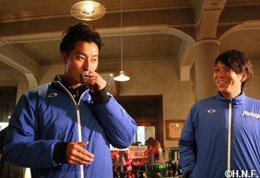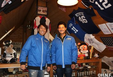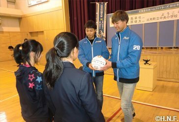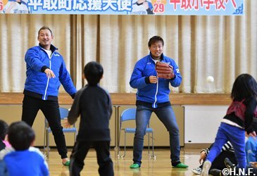 平取町応援大使の中田翔選手と井口和朋投手は、平取小学校、平取養護学校を訪問。様々な障害を持つ養護学校の子供たちが懸命にボールを投げる姿に中田選手は「こういう交流は本当に意義がある」と感慨深げに話しました。観光名所の一つ“義経神社”を参拝し、宮司から義経公が困難を乗り越え蝦夷地に上陸という説明とともに、来季の活躍を期して両選手の名前が刻まれたお守りが贈られました。人口5千人余の同町、交流会には400人超の皆様が集まり、大歓声で迎えられました。
