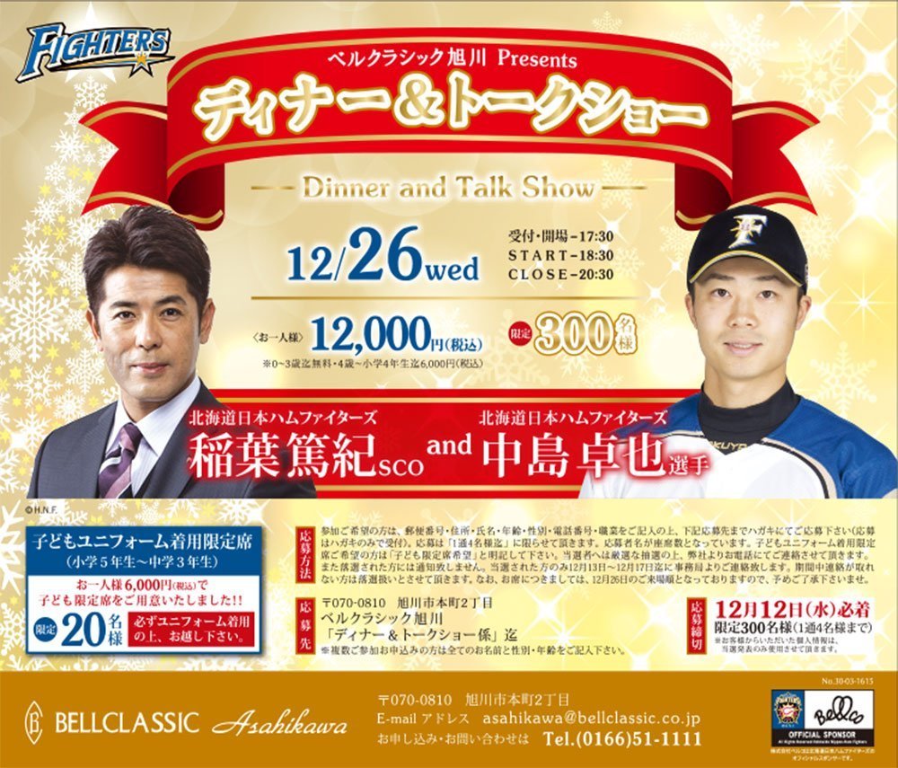 | ハガキにてお申込み 〒090-0046 北見市北6条西1丁目8-1 ホテルベルクラシック北見 『ファイターズ ディナー&トークショー』係 ●記載内容 参加者全員のフルネームと年齢・代表者様の住所・電話番号(当選時に連絡させていただく電話番号)をご記入ください ※お一人様5名まで ●配席 お席は抽選により、順次振り分けさせていただきますので相席希望の皆様は全員のお名前をフルネームにてご記入いただいた方のみとさせていただきます