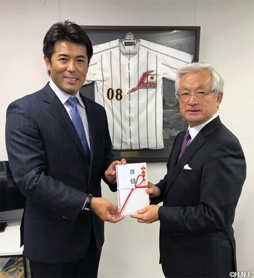 同日、北海道日本ハムファイターズを代表して稲葉篤紀スポーツ・コミュニティー・オフィサー(SCO)が東京都内の同協会を訪問。山中正竹会長へ、目録を手渡しました。被災地域の野球振興へ役立てていただく目的で寄託。同試合は来場者1人につき50円と、募金を今回の寄付に充て、北海道胆振東部地震の復興支援も目的としてしていました。