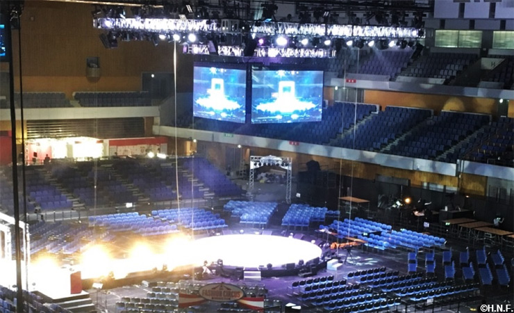 8.9mmピッチLED(幅5m×高さ3m)の大型ビジョンをセンターに4面設置いたします。