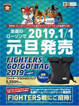 北海道日本ハムファイターズオフィシャルスポンサー・ローソンでは、毎年大好評の北海道ローソンオリジナル企画「FIGHTERS GO!GO!バッグ2019」を、元日の2019年1月1日(火・祝)に発売いたします。2019年は『応援』をテーマに、黒を基調としたロールトップパックを含む、ココでしか手に入らないオリジナルグッズが全部で7点!元日はお近くのローソンへGO!GO!また、1月5日(土)からはファイターズオフィシャルオンラインストアやオフィシャルショップでも販売いたします。数量限定となりますのでご購入はお早めに!