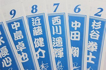 フレップのだるまから出ている紐を引っ張るとおみくじがでてきます。裏面は選手の名前やサインが入った千社札になっています。千社札のデザインは、杉谷/中田/西川/近藤/中島卓/清水/松本/上沢/清宮/大田の全10選手です。新年の運試しにぜひ挑戦してみてください!
