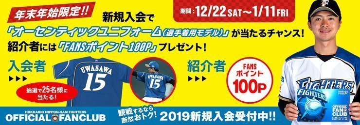 さらに、新規入会いただいた方の中から抽選で「オーセンティックユニフォーム(選手着用モデル)」が当たるチャンス!既に会員の方も、ご家族・ご友人をご紹介でFANSポイントをプレゼント♪ 詳しくは下記画像をクリック!