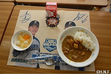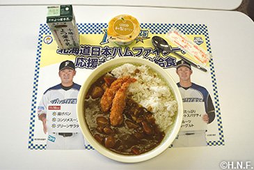 | 市町村・給食センター からのコメント | 今回、公文投手が小学生時代の思い出のカレー具材として教えてくれたのが「ミンチ」でした。八雲町では、『ミンチカレー』がメニューになかったため、さっそく、給食に取り入れさせていただき、八雲町全小中学校のみなさんに食べていただきました。子どもたちの様子や感想からも大変おいしかったようで、今後も給食メニューで登場させていきたいと思います。また、今回の給食を機に子どもたちが好き嫌いせず、なんでも食べられるようになり、丈夫で健康的な体が作れるようになればと思います。 |