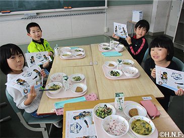 | 市町村・給食センター からのコメント | 両選手の「好きだった給食メニューや家庭での献立」、「出身地の名産品」をなるべく取り入れるように献立を考えました。選手は、身体作りのために「好き嫌いなく、野菜もしっかり食べること」を意識していることを子どもたちへ伝えました。給食で初めて出る『いわしのカリカリフライ』を苦手とする子どもたちもいましたが、頑張って一口は食べようとする様子が見られました。給食を通して、応援大使のお二人を身近に感じ、好き嫌いなく食べること、給食の大切さを学ぶ良い機会となりました。 |