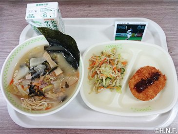 | 市町村・給食センター からのコメント | 横尾選手の出身地、神奈川県のご当地メニュー『横浜家系ラーメン』と石井一選手が体作りのために意識して食べている「鶏肉」を使った『バンバンジーサラダ』を提供しました。普段は入っていないチャーシューやのりのトッピングに子どもたちはおいしいと喜んでいました。この企画を通して、食べることの楽しさや好き嫌いなくいろんな食材を食べることの大切さを感じる、良い機会になったと思います。 |