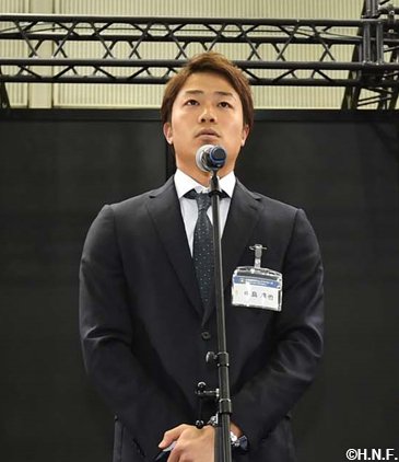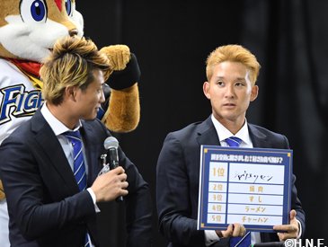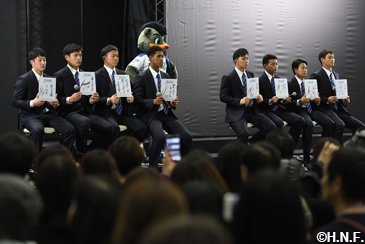 最後は新人8選手がステージ上へ。お互いの共通点などさまざまな話題を語り合い、最後は今年の抱負を色紙にしたためて披露しました。ドラフト1位の吉田輝星投手は「1軍で活躍してチームも日本一になることが目標です」と話し、日本通運出身で、即戦力の期待がかかる生田目翼投手は「開幕1軍が目標。勝てる投手になりたいです」と意欲十分に語っていました。