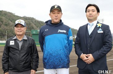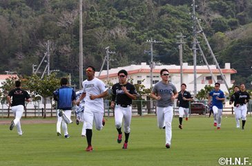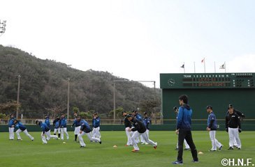 ファームの春季キャンプが沖縄県国頭村のかいぎんスタジアム国頭で始まりました。練習前に行われたセレモニーでは、国頭村の宮城久和村長から「キャンプ中、けがのないように心身を鍛えて、次に来るときには、日本一のフラッグを持って戻ってきてください」と激励を受けました。荒木大輔ファーム監督は「キャンプは選手にとって厳しい練習をこなす期間。ファンの皆様の応援が力になります。ぜひグラウンドに足を運んで応援してほしい。国頭村の皆様には大変お世話になりますが、秋に良い報告ができるよう頑張ります」と挨拶しました。
