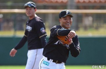 初のキャンプとなる新人8人は自主トレーニング期間とは異なり、ユニホームに袖を通して練習に臨みました。吉田輝星投手は「18番はやっぱりかっこいいと思いましたし、気が引き締まる。背番号に見合う活躍がしたい」ときっぱり。キャンプ初日は投内連係やゴロ捕球などの練習をこなし、「緊張感がありました。先輩たちに負けずに声を出して、活気づけていきたいです」と引き締まった表情で話しました。また、柿木蓮投手は「キャンプになるとスイッチが入ります。しっかり状態を上げていきたいです」と、2月16日の紅白戦をきっちりと見据えていました。