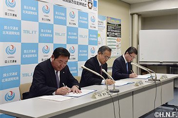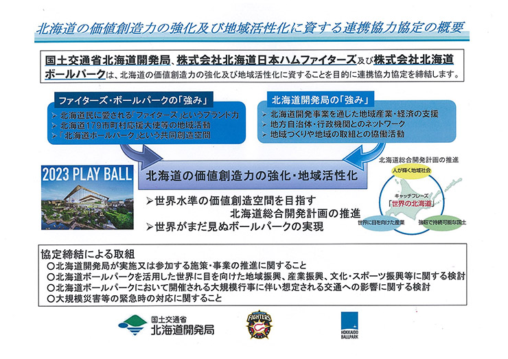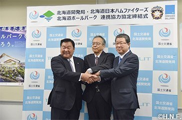 北海道日本ハムファイターズは2月5日(火)、国土交通省北海道開発局および株式会社北海道ボールパークと「北海道の価値創造力の強化と地域活性化に資する連携協力協定」を締結しました。この協定に基づき、「北海道開発局が実施または参加する施策・事業の推進」「きたひろしま総合運動公園内に整備するボールパークを活用した世界に目を向けた地域振興、産業振興、文化・スポーツ振興等に関する検討」「ボールパークで開催される大規模行事に伴い想定される交通への影響に関する検討」「大規模災害等の緊急時の対応」「その他必要と認められる事項」の5項目で3者がより緊密かつ組織的な連携・協力体制を構築してまいります。