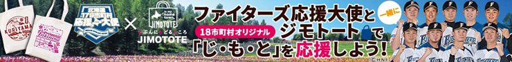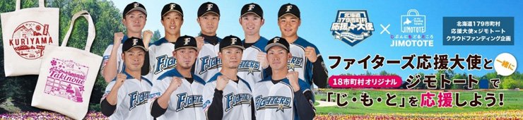 北海道日本ハムファイターズでは2019年も、株式会社ジムニーワークス(所在地:札幌市中央区、代表取締役社長:珊瑚 和範)が展開するオリジナル企画商品『JIMOTOTE(ジモトート)』と〈北海道179市町村応援大使〉の活動を連動させた〈ファイターズ応援大使と一緒にジモトートで「じ・も・と」を応援しよう!〉をスタートいたします。