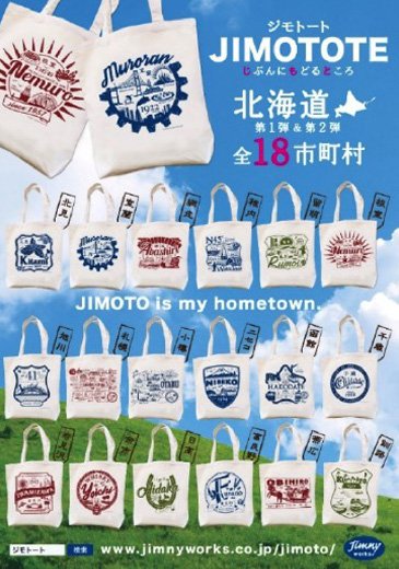 ジムニーワークスが、“じぶんに・もどる・ところ”をコンセプトに立ち上げた『JIMOTO』(じもと)ブランドのオリジナル企画商品が『JIMOTOTE』(ジモトート)です。北海道内の市町村に注目して、各地区を象徴する物産、文化、観光名所などを地元ならではの目線で取り上げ、地元の人達が誇りに思っているもの、懐かしく想っているものなどを独自のロゴマークとして、デザインしてプリントしたトートバッグが“JIMOTOTE”です。2015年4月にシリーズ第1弾/12市町村(旭川、札幌、小樽、ニセコ、函館、千歳、岩見沢、余市、日高、富良野、帯広、釧路)、同年10月にシリーズ第2弾/6市町村(北見、室蘭、網走、稚内、留萌、根室)を商品化し、現在は2016年、2018年に本プロジェクトで商品化した44市町村も含め全72市町村のデザインにて商品展開中です。