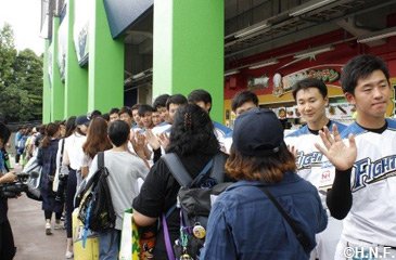 開幕シリーズを記念して、3月21日(木・祝)の試合では、内野ゲート入場時に2Fコンコースにて、荒木大輔ファーム監督をはじめ、コーチ陣・選手たちがご来場する皆様をウェルカムハイタッチで出迎えます。万が一の怪我を防止するため、いつもとは逆の方向に並び、利き腕とは違う手でタッチを行います。ハイタッチの際は、軽く手を合わせ、決して腕をつかんだり、引っ張らないよう、スムーズな進行ができますよう、ご協力のほどよろしくお願いいたします。