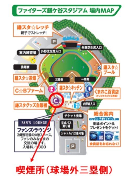 より多くのお客様に快適に観戦していただくため、今シーズンよりスタジアム内は全面禁煙となります。一、三塁側階段踊り場にあった喫煙所を廃止し、所定の喫煙所は球場外三塁側の喫煙エリア一箇所のみとなります。試合中喫煙を希望されるお客様は内野一塁側ゲート係員までお申し出いただき、再入場の手続きを行ってください。