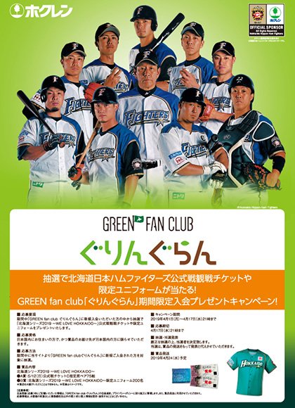 北海道日本ハムファイターズのオフィシャルスポンサー、ホクレン農業協同組合連合会は、北海道農業とホクレンの応援団になっていただきたいという思いから設立したファンクラブ「GREEN fan club ぐりんぐらん」の新規入会キャンペーンを4月1日(月)から実施しています。
