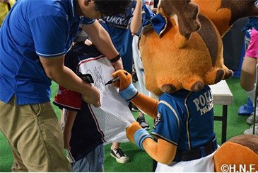 | 内容 | 試合終了後のグラウンド開放で、マスコットから直筆サインがもらえるサイン会です。 サインを記入するものは、参加するお子様の好きなもの(色紙・グッズ等)をご持参ください。 【参加マスコット】