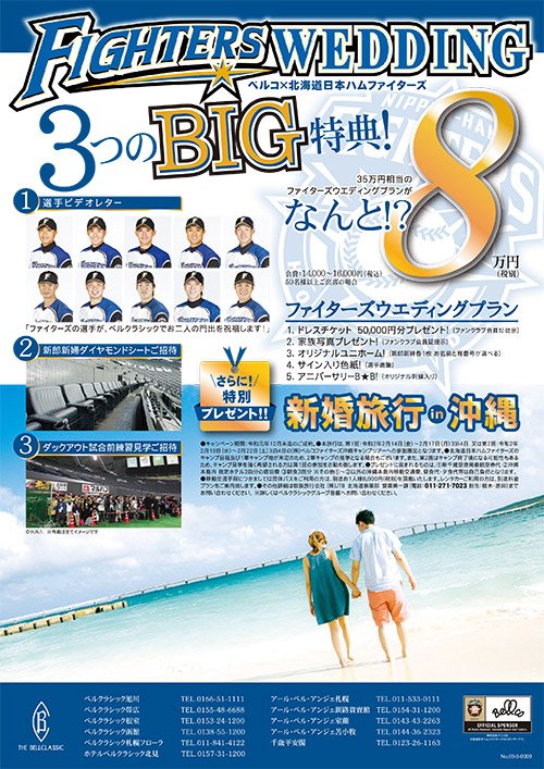 北海道日本ハムファイターズオフィシャルスポンサー・株式会社ベルコは選手からのビデオレターやダイヤモンドシート試合観戦などの特典がつく大好評のウエディングプラン「Fighters Wedding」を商品化し、ファイターズと一緒にウエディングの演出を手がけています。さらに今年で11回目となるこの企画において、これまでに12組のご結婚をお手伝いしています。あなたも「札幌ドームでプロポーズ大作戦!2019」で、彼女へ感動的なサプライズをプレゼントしませんか?