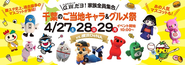 ファイターズ鎌ケ谷スタジアムでは、4月27日(土)~29日(月・祝)のイースタン・リーグ3連戦において〈千葉県ご当地キャラ&グルメ祭り〉を開催いたします。