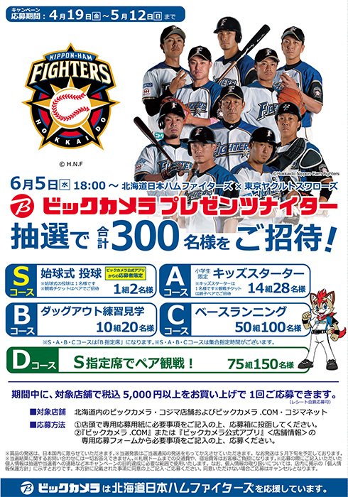対象店舗で5,000円(税込)以上をお買い上げいただき、ご応募いただくと、6月5日(水)の東京ヤクルトスワローズ戦(札幌ドーム)で始球式ができる権利やグラウンドにおりてファイターズの練習が見学できる権利、ペア観戦チケットなどが当たるチャンス!詳しくは店頭の販売員にお尋ねいただくかビックカメラ公式ホームページをご覧ください。
