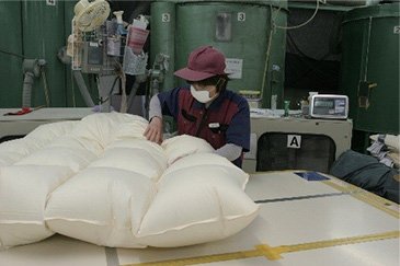 独自のフレッシュアップ加工で、羽毛本来のふっくら感を引き出しています。羽毛の膨らみを回復、同時に衛生加工を施し、3回の除塵(ちり取り)を行った後、良質なダウンを選別します。お客様からご注文をいただいた後、羽毛を充填し、出来たての羽毛掛け布団をお届けします。