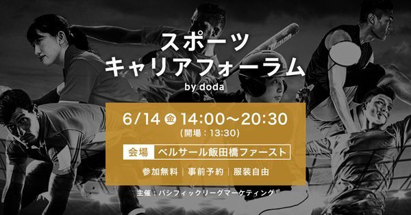 当イベントは、パ・リーグ6球団をはじめとするスポーツ関連企業が一堂に会し、転職を考えるビジネスパーソンの方々に、ビジネスとしてのスポーツをより知っていただくための中途採用イベントです。また2019年度パシフィック・リーグオフィシャルスポンサーである総合人材サービスのパーソルグループから、パーソルキャリア株式会社が運営する転職サービス「doda」のご協力のもとイベントを開催いたします。