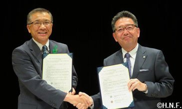 2015年には宮西尚生投手、浦野博司投手、マイケル・クロッタ投手が応援大使に就任し、同年5月には応援大使事業をきっかけにして、ファイターズ芽室後援会が発足。2017年7月には「北海道スマイルキャラバン」を開催するなど、様々な事業を通じて交流を深めてきた中で、今回のパートナー協定締結となりました。芽室町中央公民館で行われた調印式に出席した手島旭芽室町長と川村浩二社長は、これからの3年間の協力を約束し、集まった町民約500名の前で固い握手を交わしました。