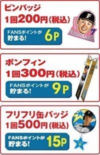 球場正面ファンクラブブースではピンバッジ、ボンフィン、フリフリ缶バッジなど3種類のガチャポンを実施します。