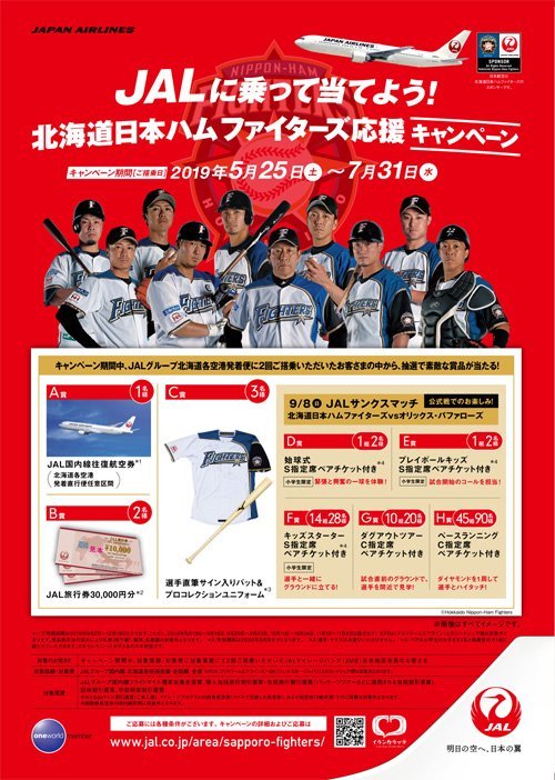 日本航空では、5月25日(土)から7月31日(水)までの期間、「JALに乗って当てよう!北海道日本ハムファイターズ応援キャンペーン」を実施中です。期間中にJALグループの北海道各空港発着便に対象運賃で2回ご搭乗いただいたお客さまの中から抽選で、「選手直筆サイン入りバット&プロコレクションユニフォーム」や「JAL国内線往復航空券」など素敵な賞品が当たります。応募条件など詳細はJALウェブサイトでご確認ください。皆様のご応募をお待ちしております。