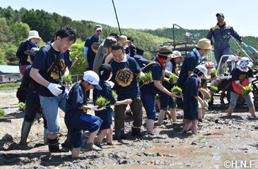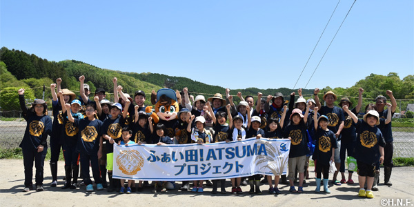 北海道日本ハムファイターズでは、昨年9月の北海道胆振東部地震で被災した厚真町の復興を後押ししようと、同町が実施している「田んぼのオーナー」制度を活用した「ふぁい田!ATSUMAプロジェクト」を今春始動しました。5月25日(土)は一般募集に応募されたご家族13組と球団職員、マスコットのポリーら合わせて50人が参加し、北海道を代表する高品質米「ななつぼし」の田植えを行いました。