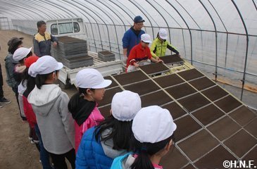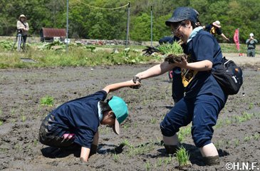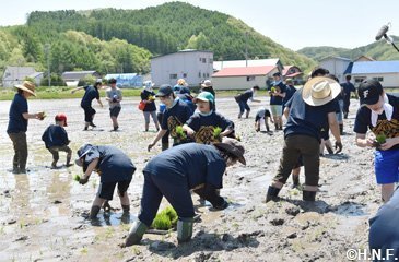 長靴や素足が泥まみれになりながらも皆さんの手際がよく、予定区画は1時間ほどで田植えが終了。北海道の独立行政法人である農業試験場に勤務し、震災後に被災地で作付け再開が可能かの地質調査を行った千歳市の三戸はるかさんは「農業の大切さを自分の子どもたちに伝えたくて参加しました。再び田植えができるようになって何よりです」と話していました。札幌市の小学生、藤岡叶多(かなた)君も「泥の中がふわふわしていて気持ちよかった。早く立派に育ってほしい」と初めての田植えを振り返っていました。