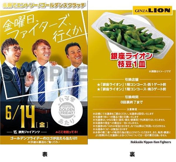 2019年シーズン第3回となる6月14日(金)では、今季初のビール半額デーを実施いたします。名刺提出でエントリーできる「ゴールデンスクラッチ」は当選確率30%となる「銀座ライオン 枝豆」。1名様にビッグなプレゼントが当たる大抽選会の賞品は野口観光グループ・ペア宿泊券です。また、ご来場25,000名様には「ジャイアンツ×ファイターズ」選手クリアファイルをプレゼント。働くみなさん、金曜夜は名刺を持って札幌ドームに集合です!