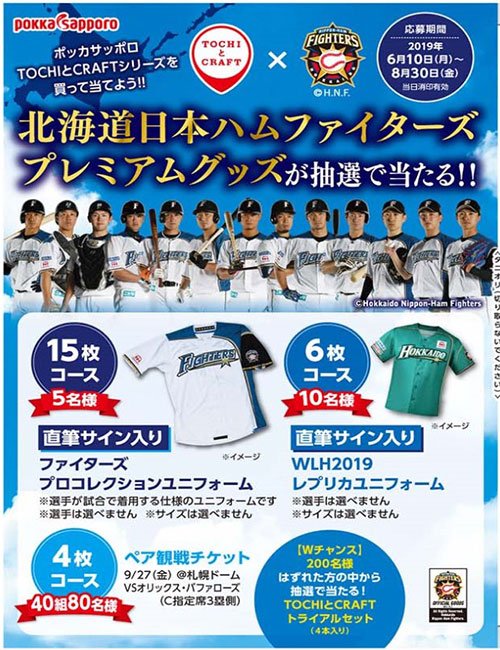 ポッカサッポロでは、6月10日(月)から北海道やさしい旨茶、焼きとうきび茶をはじめとするポッカサッポロ TOCHIとCRAFTシリーズを対象としたキャンペーンを実施いたします。抽選で直筆サイン入りファイターズプロコレクションユニフォームや直筆サイン入りWE LOVE HOKKAIDO2019レプリカユニフォームが当たります。