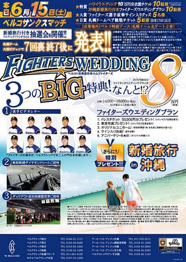 | 抽選会賞品 | 特賞 | ・ハワイウエディング10万円分衣装チケット(10組) ・Fighters Wedding(10組) |