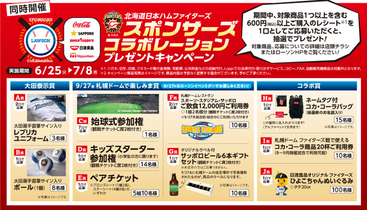 「北海道日本ハムファイターズ スポンサーズコラボレーション」も同時開催。対象商品(詳しくは店頭チラシまたは北海道エリアHPをご覧下さい)1つ以上を含む、税込600円以上ご購入のレシートを1口としてご応募いただくと、抽選で大田選手の直筆サイン入りグッズや札幌ドーム最終戦の観戦チケットの他、豪華な賞品をプレゼントいたします!