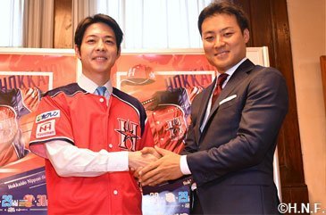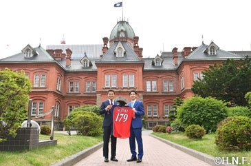 北海道日本ハムファイターズは、6月28日(金)福岡ソフトバンクホークス戦から7月21日(日)千葉ロッテマリーンズ戦までの札幌ドーム開催のホームゲーム9試合を《北海道シリーズ2019 HOKKAIDO be AMBITIOUS》と題して開催することに先立ち、田中賢介選手が北海道庁を訪問し、鈴木直道北海道知事にシリーズ期間中に着用する限定ユニフォームを贈呈しました。この日が初対面の二人でしたが、互いに今年で38歳になったこともあり意気投合し、今シーズン限りで引退を表明している田中賢選手に対し鈴木知事は「明日から始まるHOKKAIDO be AMBITIOUS期間中には、『北海道みんなの日』の企画で多くの方を招待いただき、心から感謝申し上げます。道庁と振興局でも限定ユニフォームを着用し、チームを後押できればと思います。田中賢介選手のラストシーズンで優勝できるよう応援しています」と激励の言葉を述べていました。また、田中賢選手からは「個人的には最後のシーズンを迎えてますが、これまで通りしっかりと準備をし、チームの勝利に貢献できるよう頑張ります。チームは4位ですが、明日からはHOKKAIDO be AMBITIOUSが始まるので、北海道民の皆さまと共に大志を抱いて戦っていきます」と話していました。