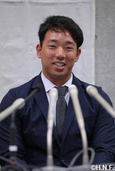 2015年にドラフト4位で読売ジャイアンツに入団し、プロ2年目には4本塁打を放った宇佐見選手は「バッティングが一番の売り」とアピールポイントを話し、「ファイターズは雰囲気が明るい印象。チームが変わり新たな気持ちで挑戦していきたいです」と新天地での活躍を誓いました。