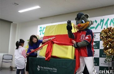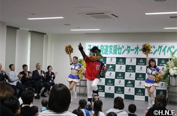 6月24日(月)にオープンしたばかりの北広島エルフィンビルの一角に移転した、こども発達支援センター。オープニングセレモニーで上野正三北広島市長は「新しいセンターにはたくさんの遊具があるので、元気に楽しく遊んでくださいね」と子どもたちに呼びかけました。さらにファイターズガールとB☆Bがお祝いのダンスを披露し、オープニングセレモニーを盛り上げました。