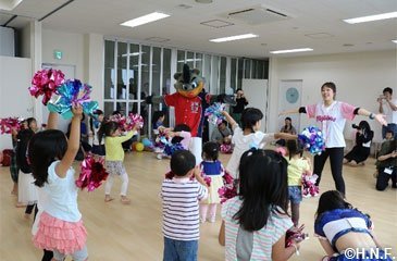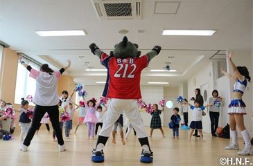 その後に行われた発達運動学習会ではファイターズガールが子どもたちに、球場の定番ダンスYMCAをレクチャー。子どもたちは一生懸命振り付けを覚え、リズムよく体を動かしました。最後はB☆Bと一緒に保護者の皆様に向けてダンスを披露。初めての動きにも関わらず「聞いたことのある曲だったから上手に踊れました」と納得の表情でした。
