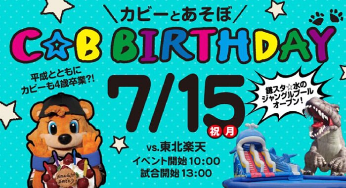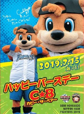 毎年「海の日」はC☆B(愛称:カビー)の誕生日です。北海道日本ハムファイターズでは7月15日(月・祝)、ファイターズ鎌ケ谷スタジアムにおきまして恒例の《C☆Bバースデー》を行います。一緒にカビーの誕生日をお祝いしませんか?来場プレゼントや子供たちの参加型イベント、「鎌スタ☆水のジャングルプール」に選手とのふれあいイベントも行われるなど、内容も盛りだくさん。皆様のお越しをお待ちしております。