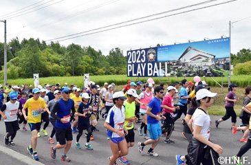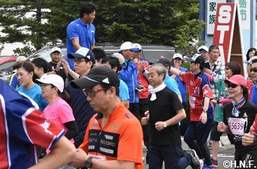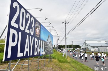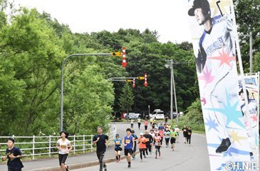 北海道日本ハムファイターズと北広島市は6月30日(日)、昨年1月に締結したパートナー協定に基づく連携事業の一環で、「きたひろしま30kmロードレース2019」(北広島市総合体育館前発着)にファイターズラン部門(5km)を設け、ロードレース終了後に同体育館で稲葉篤紀スポーツ・コミュニティ・オフィサー(SCO)のトークショーを実施しました。