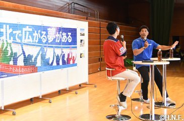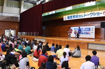 体育館で行われたトークショーは、稲葉SCOがSTV福永俊介アナウンサーと軽妙な掛け合いで盛り上げ、会場からの質問に答えながら日々の運動の大切さや2023年に開業を予定しているボールパークに寄せる期待を言葉にしていました。「北広島は緑も豊かでランニングしていても気持ちいいところだと思います。ボールパークができるとどんな風になるんだろうと思うと心躍りますし、OBでチームを作って試合がしてみたいですね」と話し、大きな拍手を浴びていました。