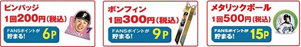 ファイターズオフィシャルファンクラブでは、ピンバッジ第2弾が登場!また、全15種類のメタリックボールガチャポン、ボンフィンガチャポンもあります!当日は観戦チケットとご本人様のファンクラブ会員証をお忘れなく!