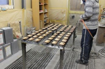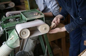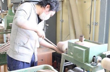 木工の工程の中で、特に手触りの良さが生み出されるのが最終工程である研磨と塗装です。研磨では主にベルトサンダーというやすりが回転する機械を使用し、丸みを表現したり、表面の凹凸を滑らかにします。力加減が重要な作業で、職人が一つ一つ丁寧に研磨しています。その後、一度下塗りを施した後に再度研磨をし、細部の凹凸を職人の手によりきれいにします。塗装には「ウレタン塗装」を施しています。ウレタン塗装は表面に膜を作るため、温度や湿度の環境変化に強く、汚れや水気などもある程度はじくようになっています。長くご愛用いただくのに適した塗装です。
