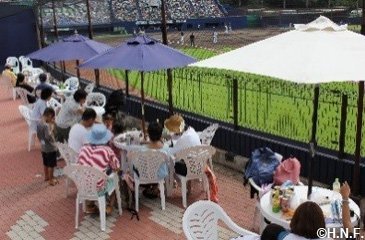 一塁側ライトポール際のファールエリア内の特別観覧席「DJチャス。ファミリーシート」を販売します。1卓1~4名様で、ネットに囲まれたセーフティーシート。ゆったりしたテーブルで安心して飲食・観戦を楽しめます♪残暑の観戦のお供に嬉しい、つめた~く冷えたアルコール・ジュースなどのドリンクセット差し入れとDJチャス。から大盤振る舞いのおもてなしをご提供します。ドリンクセットだけでも断然オトクなチケットです!