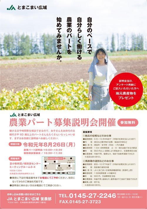 8月26日(月)、JAとまこまい広域による『農業パート募集説明会』を開催いたします。農業パートの具体的な仕事内容や働き方についての説明をはじめ、気になる点についてJA担当者へ個別相談も可能。説明会当日、アンケート用紙にご記入いただいた方には地元農産物のプレゼントもございます!